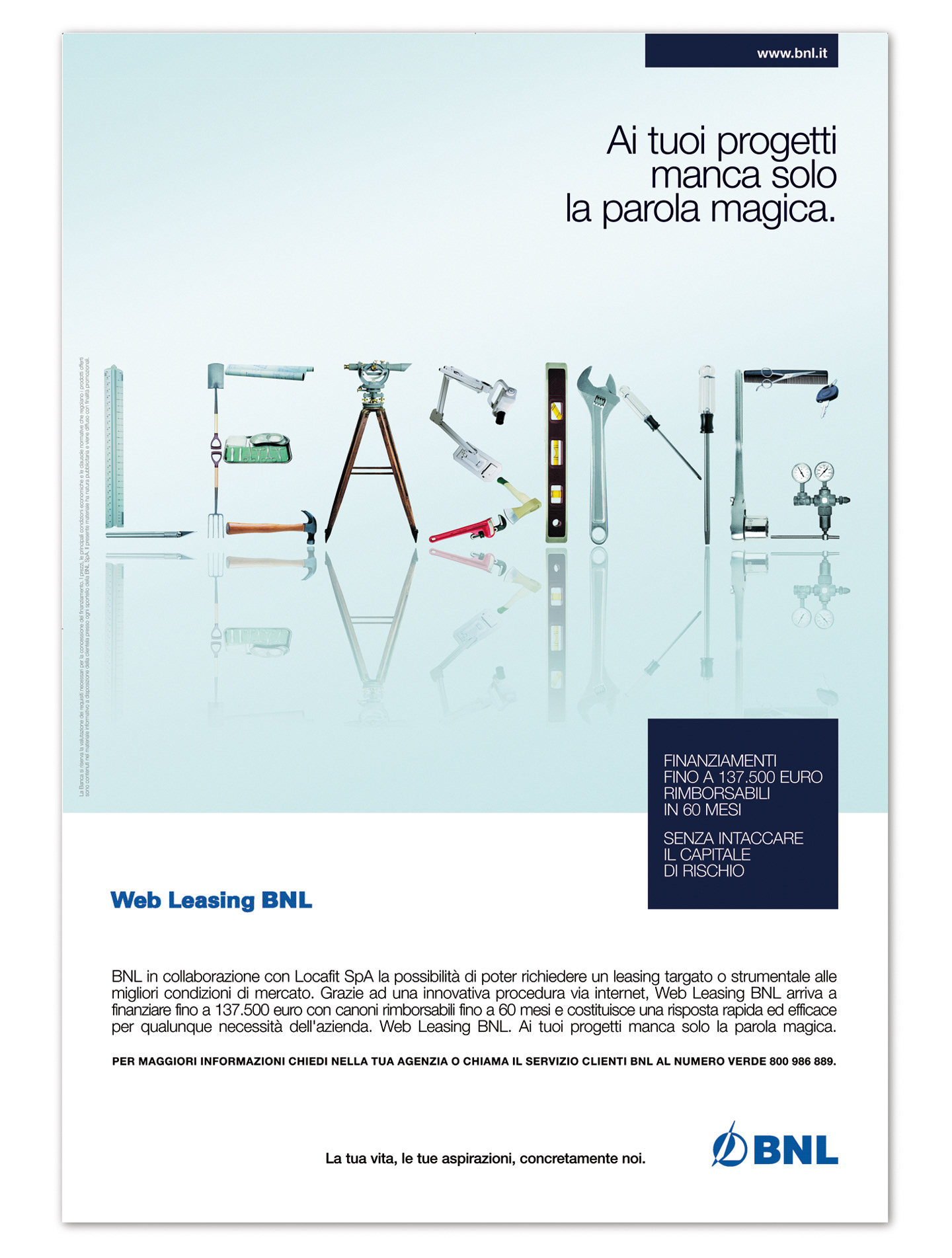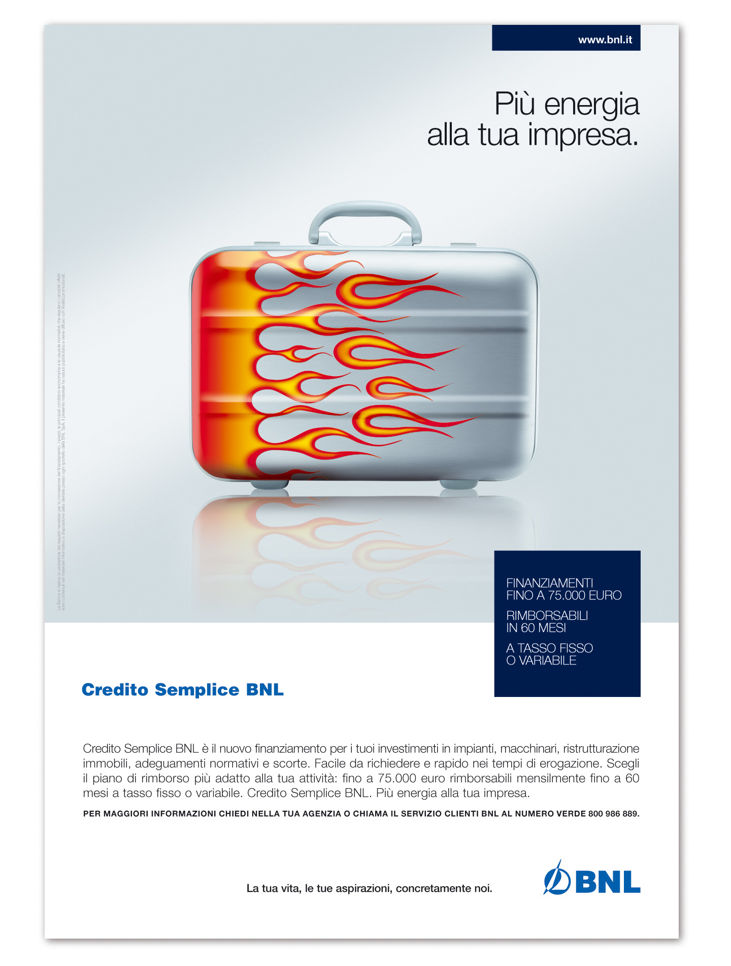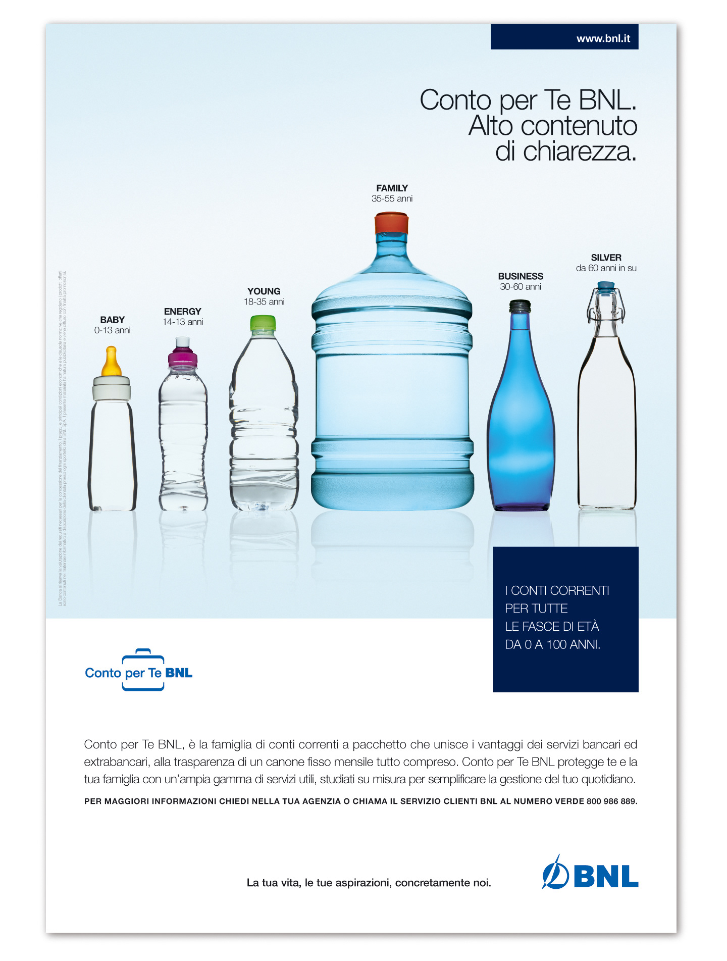 A series of creative subjects for indoor posters in BNL branches, showcasing banking products dedicated to businesses, small enterprises, and families.