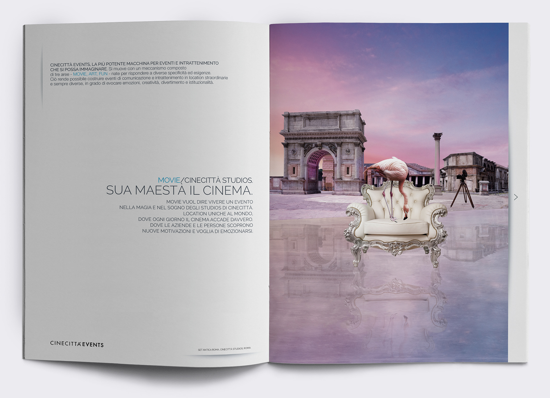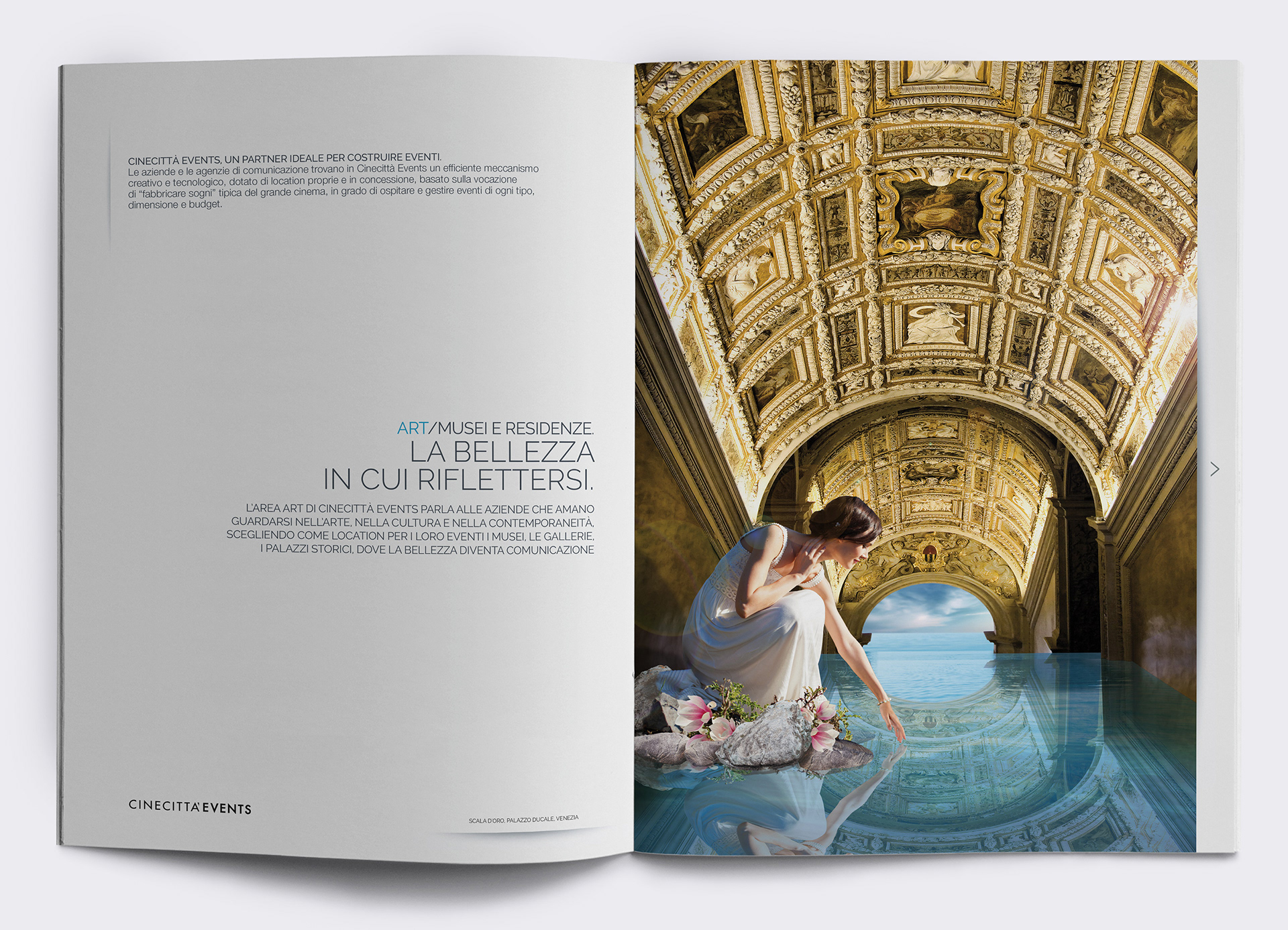 Three visual concepts, inspired by the dreamlike world of cinema, serve as the guiding motif for both this Institutional brochure and the cinecittavents.it website. Cinecittà Events stands as one of Italy's premier companies in event locations. These visual artworks are the result of detailed photomontages created using images from real event venues in Rome and Venice, Italy.