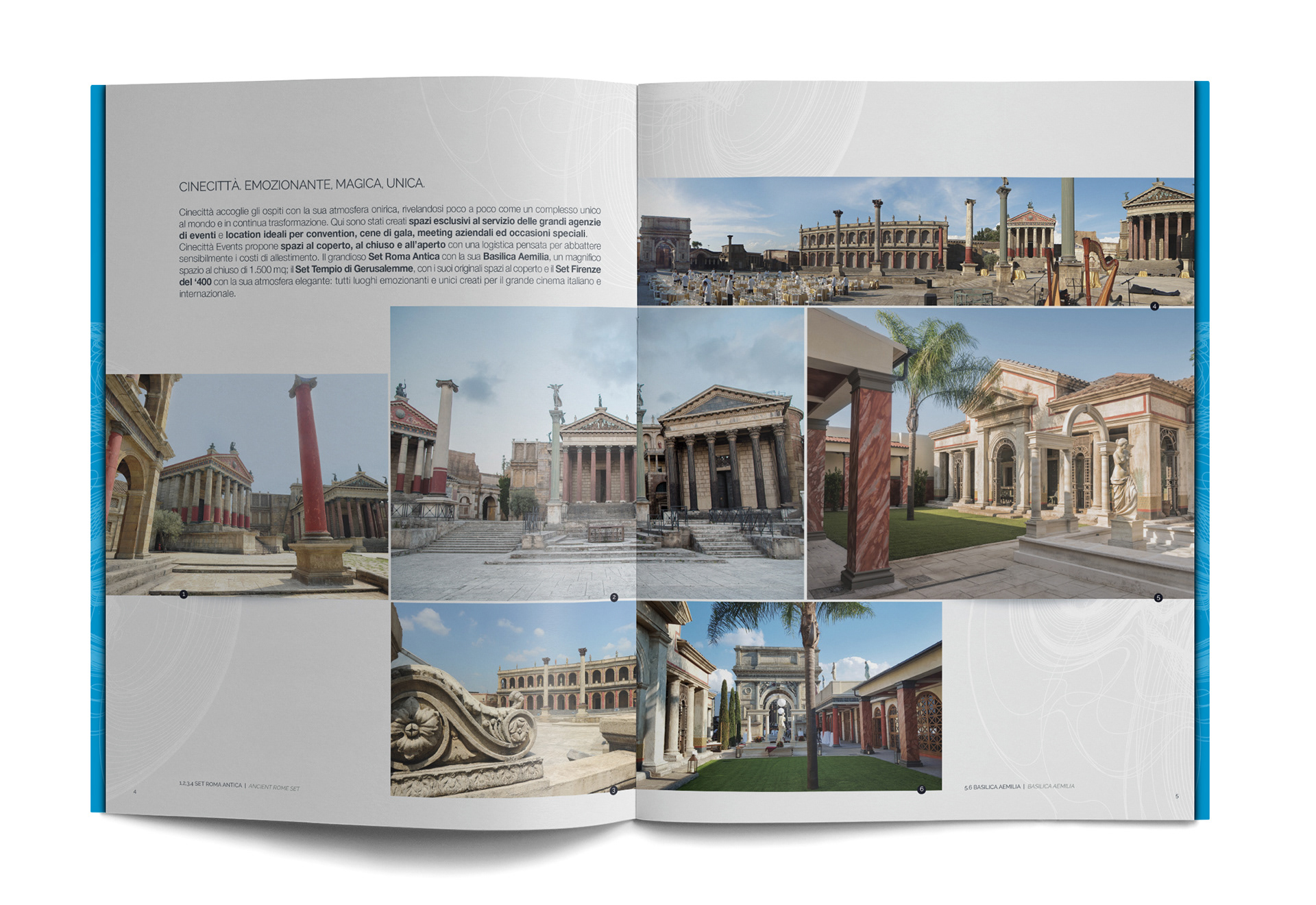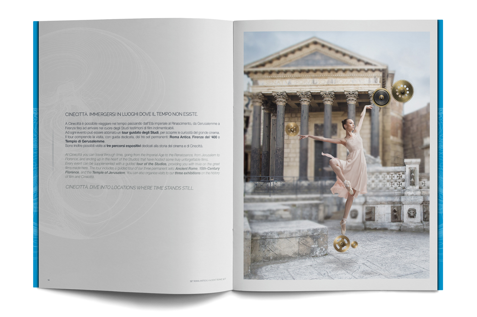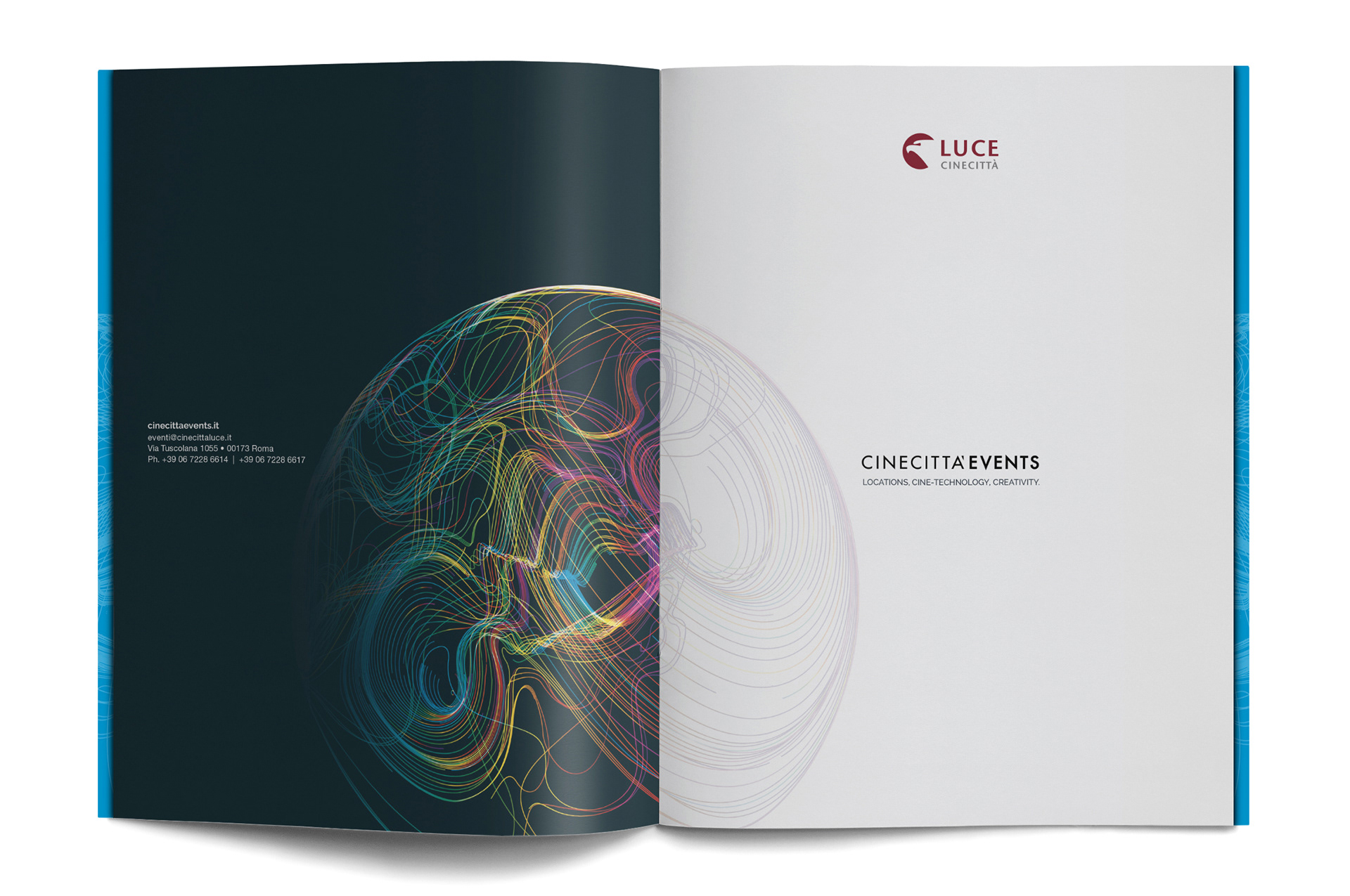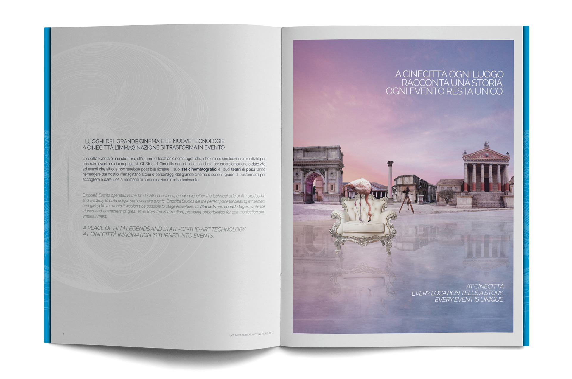 Two visual concepts, originally developed for an advertising campaign, served as the creative foundation for this Institutional Brochure, showcasing the sets and locations available for business events at Cinecittà Studios.